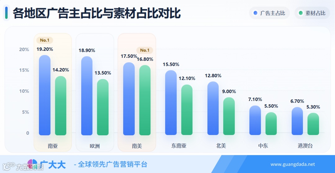 南亚以19.2%的娱乐场广告主占比位列全球第一,但其娱乐场素材投放占比仅14.2%,明显低于南美地区。这一数据差直观反映出不同区域的投放格局差异: