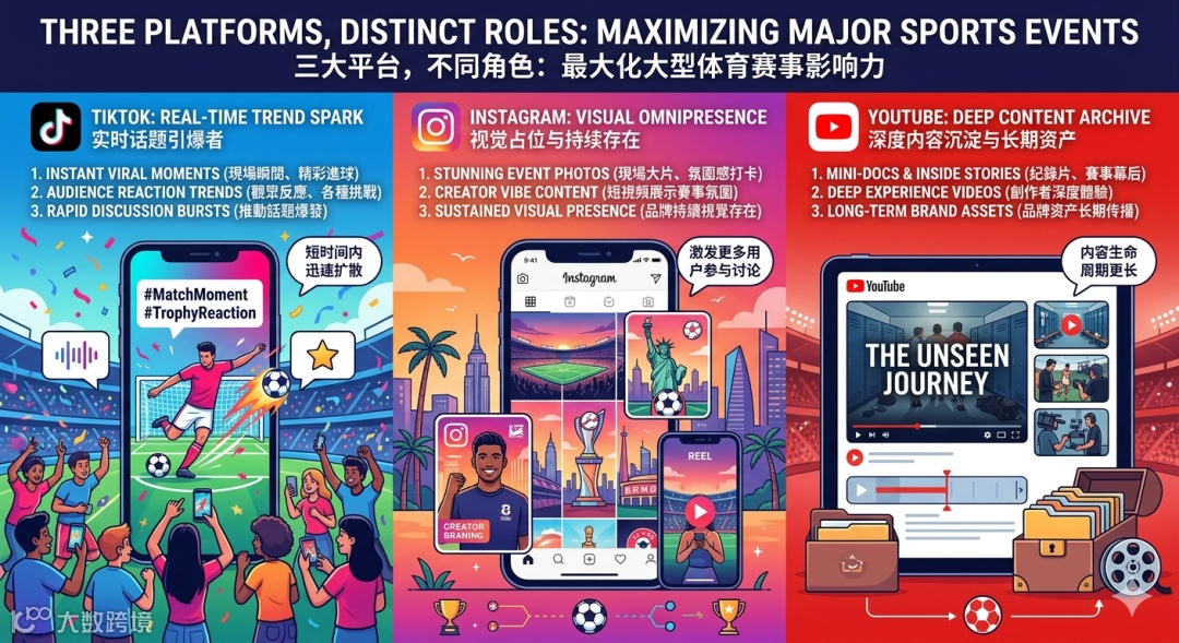 当这三个平台形成组合时,一次体育事件的传播就会形成完整链条。TikTok 负责引爆话题,Instagram 帮助品牌在社交空间中占据位置,而 YouTube 则通过深度内容沉淀事件价值。