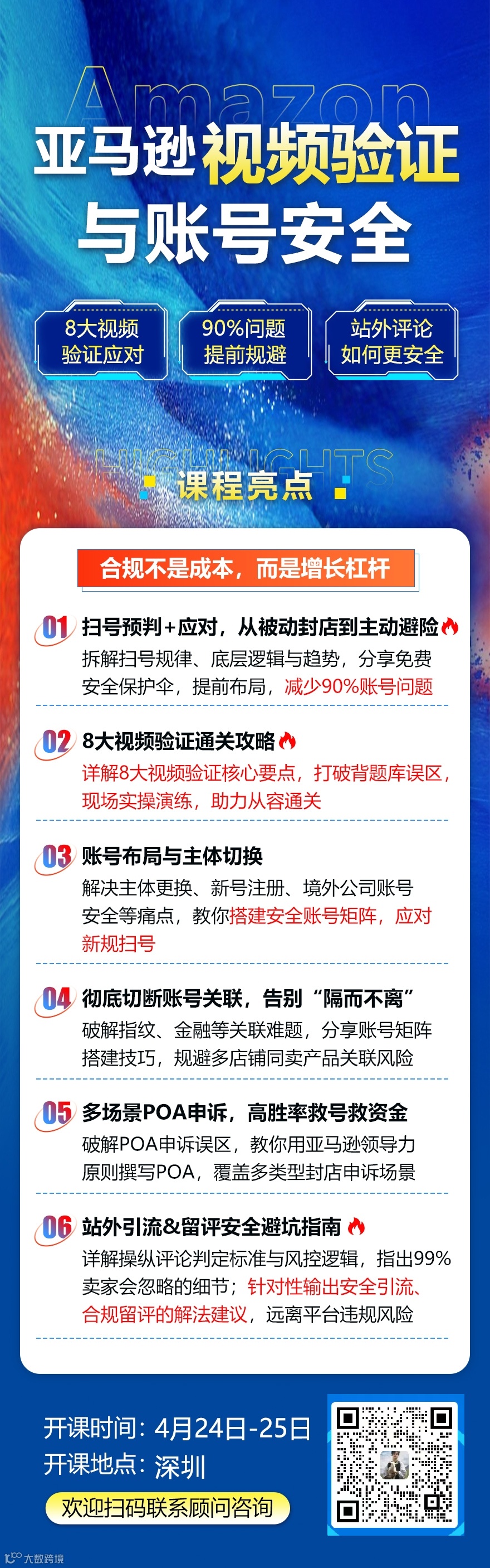为此我们再次邀请亚马逊视频验证通关高手,扫号规律研究者,白&黑打法研究员,账号安全专家Jeff老师,分享2天的合规风控体系搭建课程《亚马逊视频验证与账号安全》,量身打造系统性破局方案,帮助卖家从 “被动救火” 转向 “主动合规”,守住账号、资金、库存,才能在这轮长期的行业洗牌里活下来、走得远。