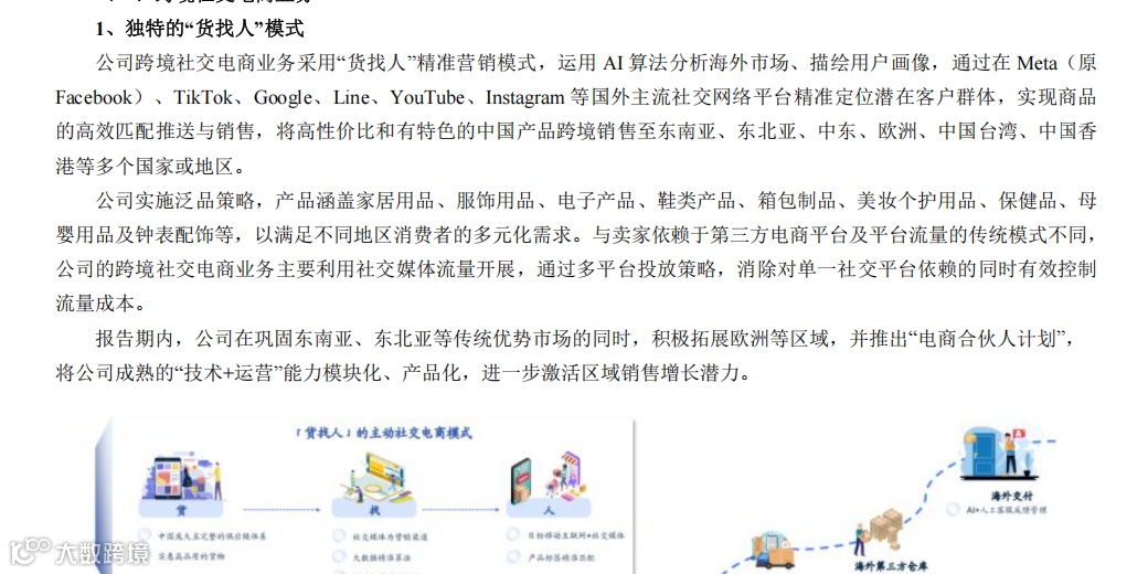 采用"多平台分散投放"策略,依托Meta、TikTok等海外社媒,通过AI算法精准定位用户,构建"货找人"销售逻辑,核心在于流量管控与投放效率优化。