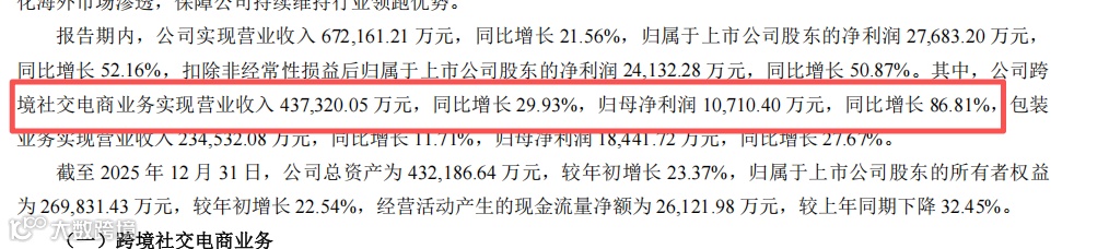 跨境电商收入43.73亿元(+29.93%),归母净利润1.07亿元(+86.81%),显著高于整体利润增速,表明已进入"规模放大+利润释放"阶段。包装业务营收23.45亿元(+11.71%),归母净利润1.84亿元(+27.67%)。
