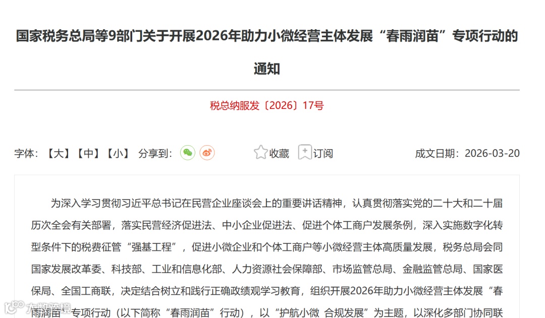 国家税务总局联合七部门启动2026年"春雨润苗"专项行动,聚焦"护航小微 合规发展"主题,推出四大类15项50条服务举措,助力小微经营主体高质量发展。