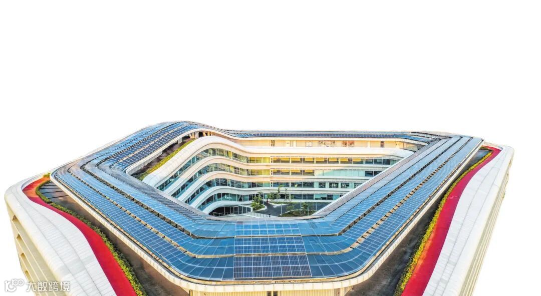 海口江东新区生态CBD楼宇顶部的光伏板整齐排列。