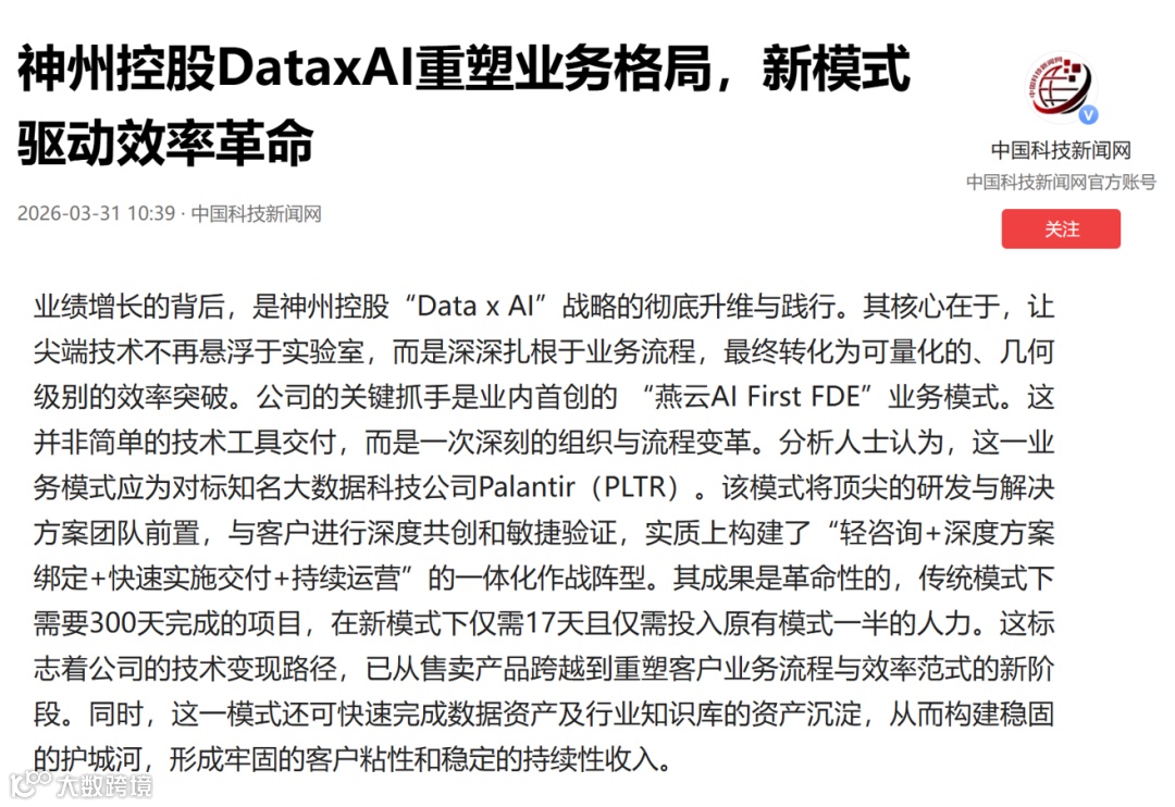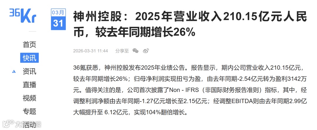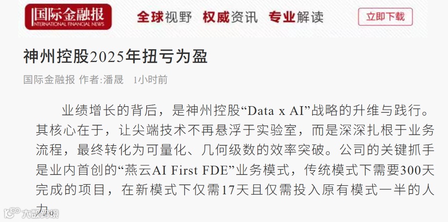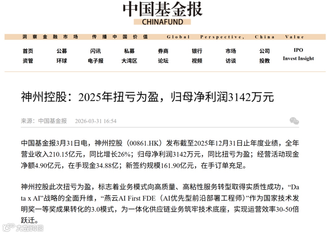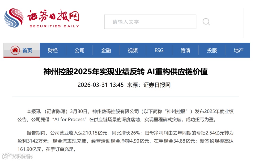 3月30日,神州控股发布2025年度业绩公告,实现里程碑式突破,成功扭亏为盈。营业收入达210.15亿元,同比增长26%;归母净利润由亏损2.54亿元转为盈利3142万元;经营活动现金流净额4.90亿元,在手现金34.88亿元;新签约订单161.90亿元。