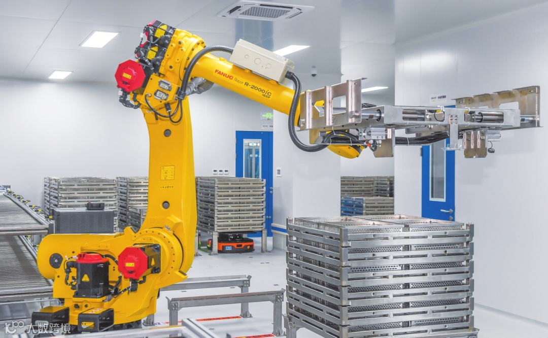 海南皇隆制药股份有限公司内,机械手臂将药剂转移至托盘。