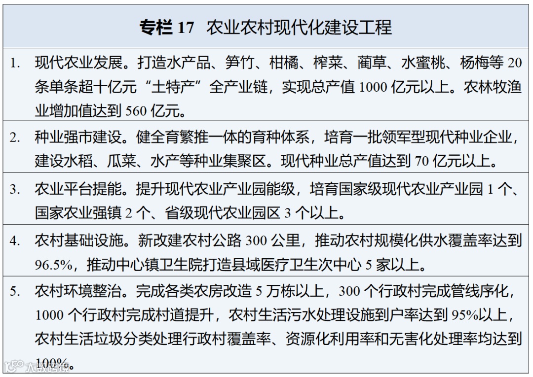 • 现代农业:加强耕地保护,提升粮食播种面积至172万亩以上,打造标志性全产业链