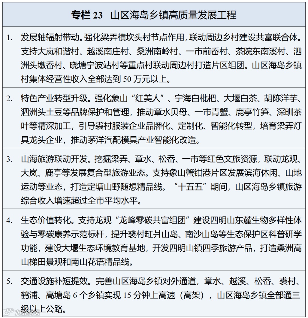 畅通城乡人口双向流动,深化农村土地制度改革,加快山区海岛乡镇高质量发展。