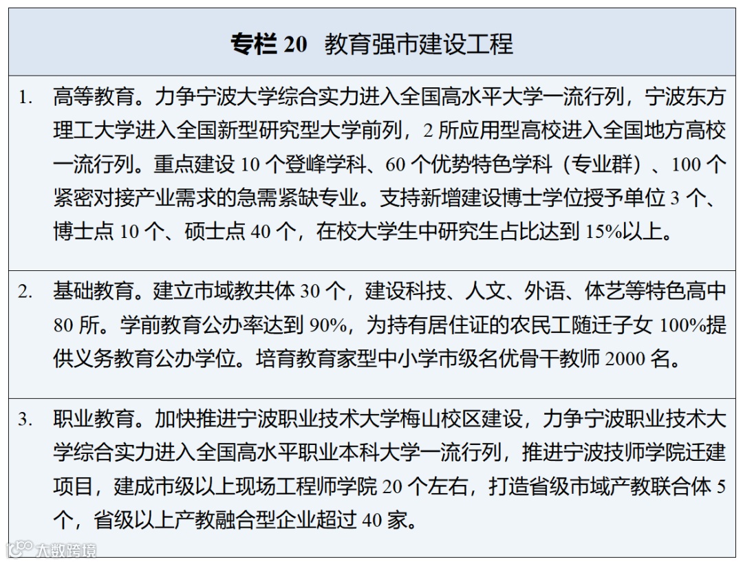 • 高等教育:推动宁波大学高质量建设"双一流",支持新型研究型大学建设