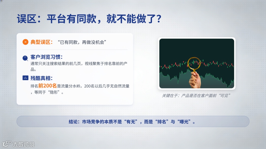 判断产品能否上架的核心标准,并非平台是否已有同款,而是该产品在搜索结果前200名的可见性。客户通常仅浏览前200名链接,超出范围则丧失自然流量。若目标产品在此排名内无展示,即使平台存在后续链接或本土卖家,市场仍属空白。此时重新上架可有效开拓市场空间。