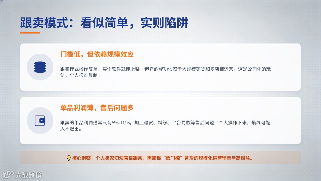 跟卖模式门槛较低,依赖规模效应运作。电商公司通过多店铺、多员工及软件批量铺货,可维持运营;但个人卖家资源有限,单品利润仅5%-10%,叠加售后纠纷与平台罚款,实际收益可能无法覆盖基础成本。更关键的是,跟卖无法积累可迁移技能,平台政策变动即面临归零风险。