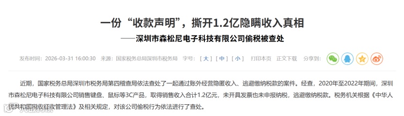 近期,国家税务总局深圳市税务局第四稽查局依法查处一起企业偷税案件,涉案企业为深耕3C领域二十余年的深圳森松尼电子科技有限公司。