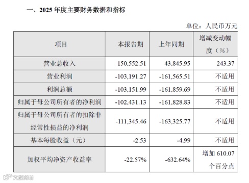 2026年2月28日业绩快报显示,摩尔线程2025年营业总收入15.06亿元,同比增长243.37%;归属母公司净利润-10.24亿元,亏损同比收窄36.70%。