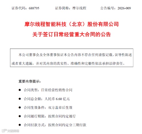 2026年3月31日公告披露,摩尔线程与某客户签订6.60亿元夸娥智算集群销售协议。合同分三期付款,2026年底前完成交付。公司以商业秘密为由豁免披露客户名称。