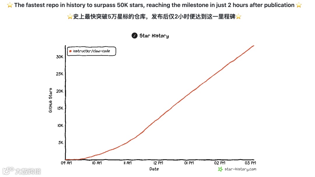 开发者@realsigridjin迅速将泄露源码备份至GitHub仓库instructkr/claude-code,上线两小时内Star数突破5万,创GitHub最快获星纪录。