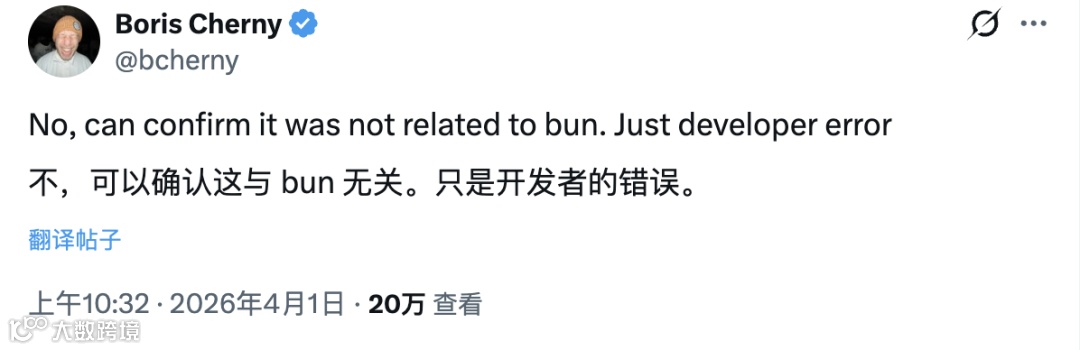 Anthropic官方确认此为打包环节人为失误,并非安全入侵,用户数据未受影响。Claude Code核心成员Boris Cherny在X平台简短回应属实。