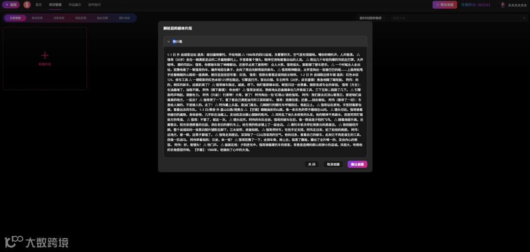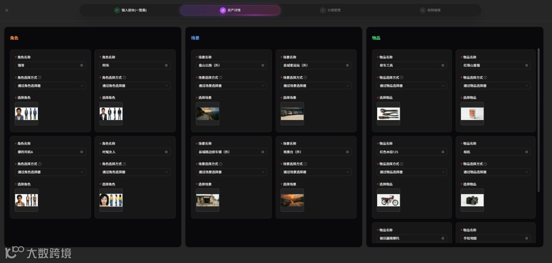 创作者仅需提供剧本文本,无需编写提示词,系统即可自动完成全流程操作。进度条实时显示"剧本-资产-分镜-视频"各环节状态,并支持对生成提示词的人工干预。