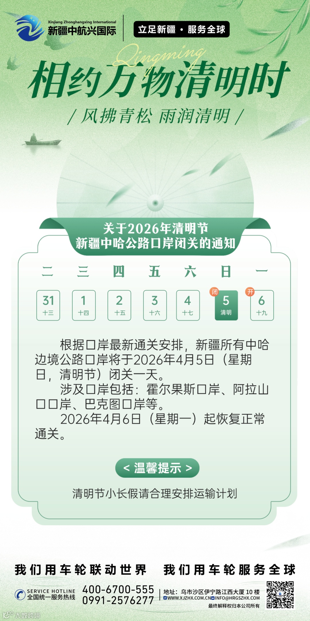 各相关客户及合作车队请注意:请提前调整货物发运、装车及出入境计划,合理规划运输时效,避免闭关影响通关进度。如有口岸通关或运输调度问题,我司将及时提供专业协助。