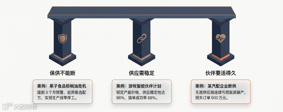保供应是底线,控成本是目标,防风险是保障。优秀采购需在每项决策中权衡三者:平衡供应连续性与成本压力,协同风险防控与资源投入,将采购职能转化为企业核心竞争力。