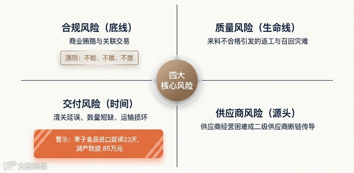 涵盖合规、质量、交付及供应商风险四类,需系统化管控以避免重大损失。