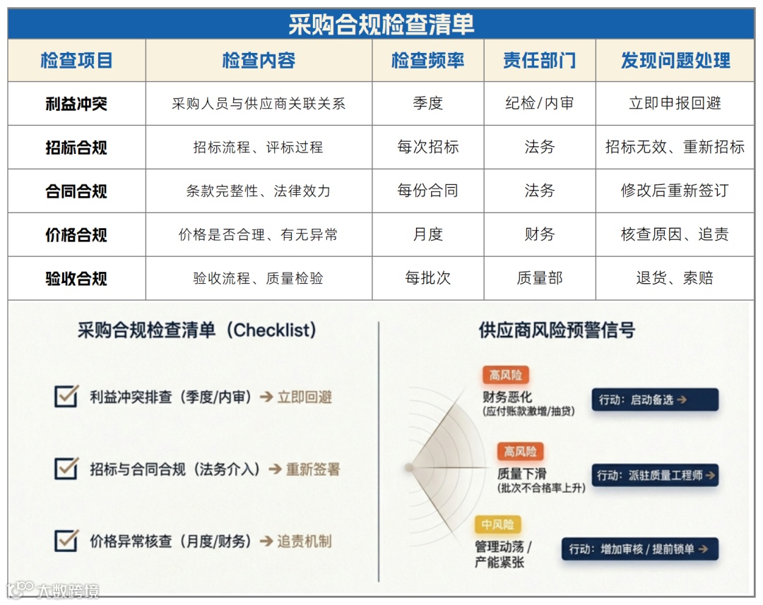 防范商业贿赂、合同纠纷等。某企业因采购人员收受回扣被重罚,彰显"三不"管理(不能、不敢、不想违规)的关键性。
