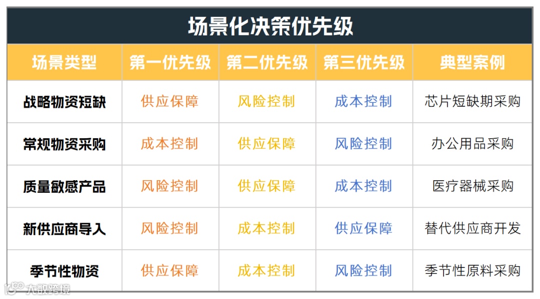 采购需依场景灵活调配重心:常规物资侧重成本优化,关键部件强化供应保障,战略品类实施风险前置管理。