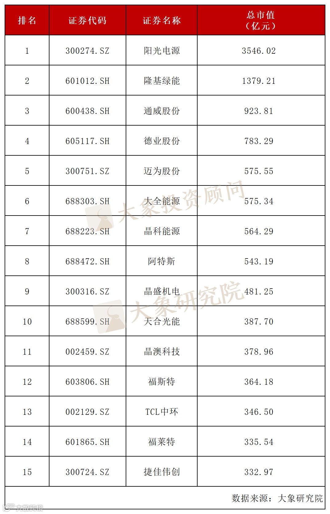 市值格局呈现"逆变器>设备>组件>材料",阳光电源以3546.02亿元市值领跑。资本市场对设备赛道高盈利性高度认可,而组件龙头因产能过剩及盈利波动导致估值承压。