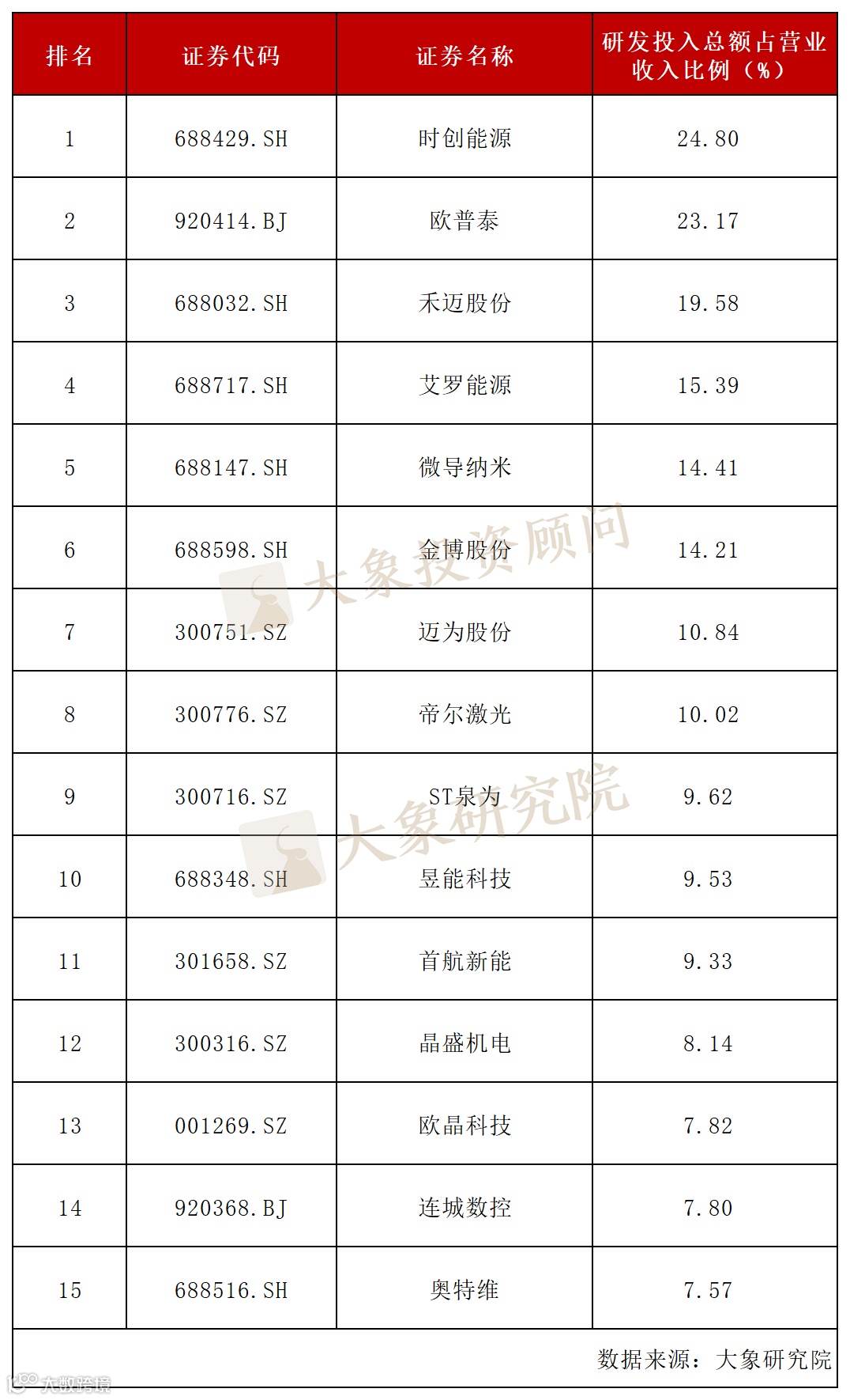 2025年前三季度中国光伏设备行业研发投入占比榜单(TOP5)