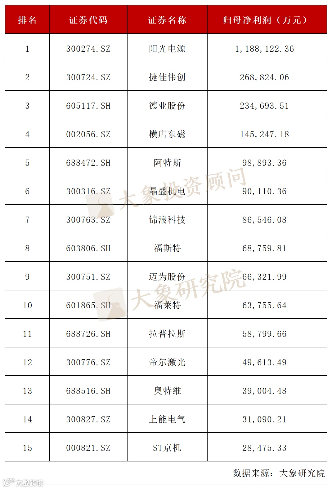 2025年前三季度中国光伏设备行业净利润榜单(TOP5)