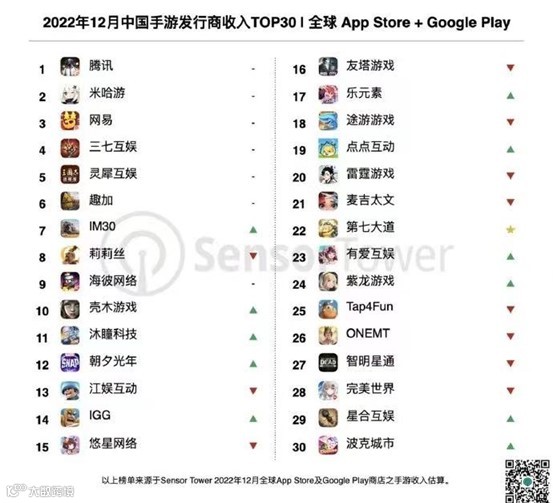 初入2023年,一则#国产手游12月收入超21亿美金#的话题冲上微博热搜,作为门类中的排头兵自然要被媒体们拉到观众视野面前评比一番。1月10日,据Sensor Tower报告,2022年12月共43个中国厂商入围全球手游发行商收入榜 TOP100,计收入超21亿美元(约合人民币142.38 亿元),占本期全球TOP100手游发行商收入39.3%。其中,腾讯、米哈游、网易、三七互娱、灵犀互娱、趣加、IM30、莉莉丝、海彼网络、壳木游戏位列中国厂商的前十位。
