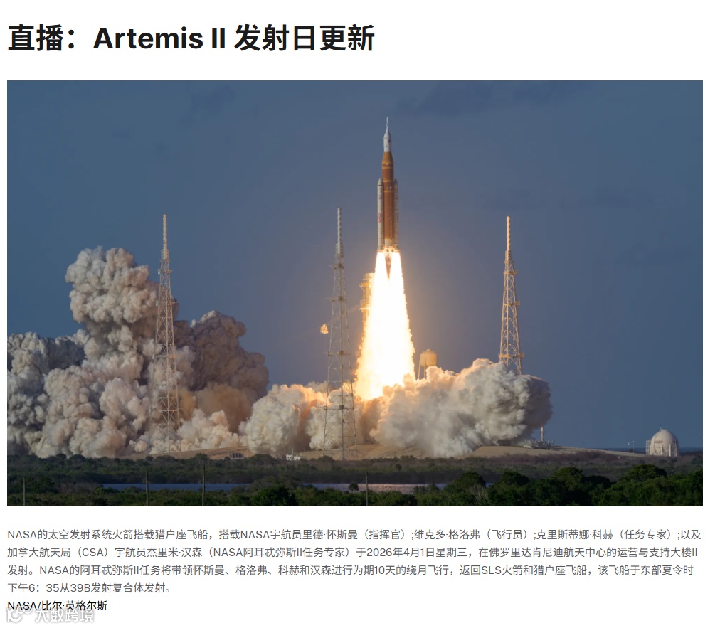 NASA阿尔忒弥斯2号探月任务成功发射,四名宇航员开启54年来首次重返月球轨道之旅。此次任务采用太空发射系统(SLS)Block 1火箭搭载猎户座飞船,将进行为期10天的绕月飞行,为后续载人登月奠定技术基础。