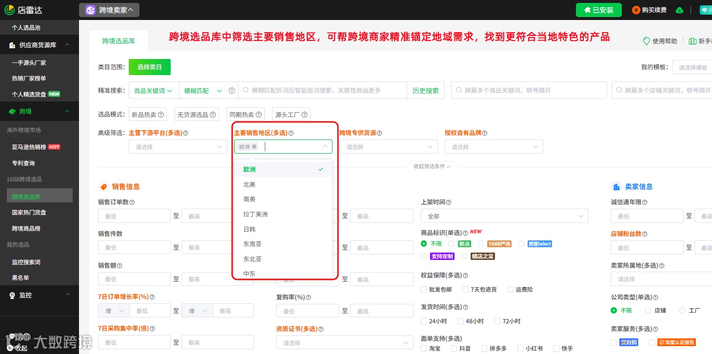 同时,可利用店雷达跨境选品库,筛选主要销售地区,结合海外市场需求,布局适配当地消费习惯的品类,如面向欧美市场的户外用品、面向东南亚市场的家居日用品等,减少因需求不匹配导致的退货,提升订单转化率。