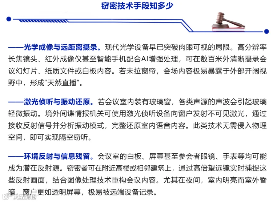 拉上窗帘,这个简单的动作究竟是为了防御什么呢?它防的绝不是无心之人的随意一瞥,而是越来越先进的远程无接触窃密技术手段。今天,小安为大家揭秘几种常见的窃密技术手段与防护方法,希望大家提高警惕,筑牢安全防线。