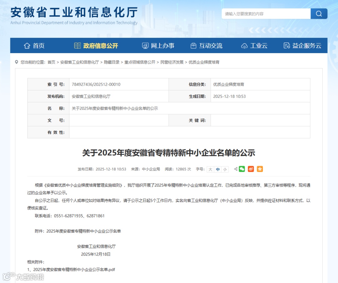 根据《安徽省优质中小企业梯度培育管理实施细则》,经各地审核推荐、第三方审核等程序,我司顺利通过评审,成功入选2025年度安徽省专精特新中小企业公示名单。