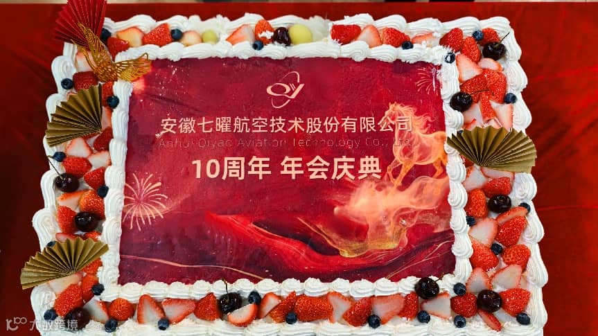 抽奖环节结束后,一个印有“安徽七曜航空技术股份有限公司 10周年年会庆典”字样的巨型蛋糕被缓缓推上舞台。王总在全场齐声的“10周年快乐”祝福中,切下第一刀,象征分享十年奋斗的甜蜜果实。掌声与欢呼声中,这份甜蜜传递到每一位七曜家人的手里!