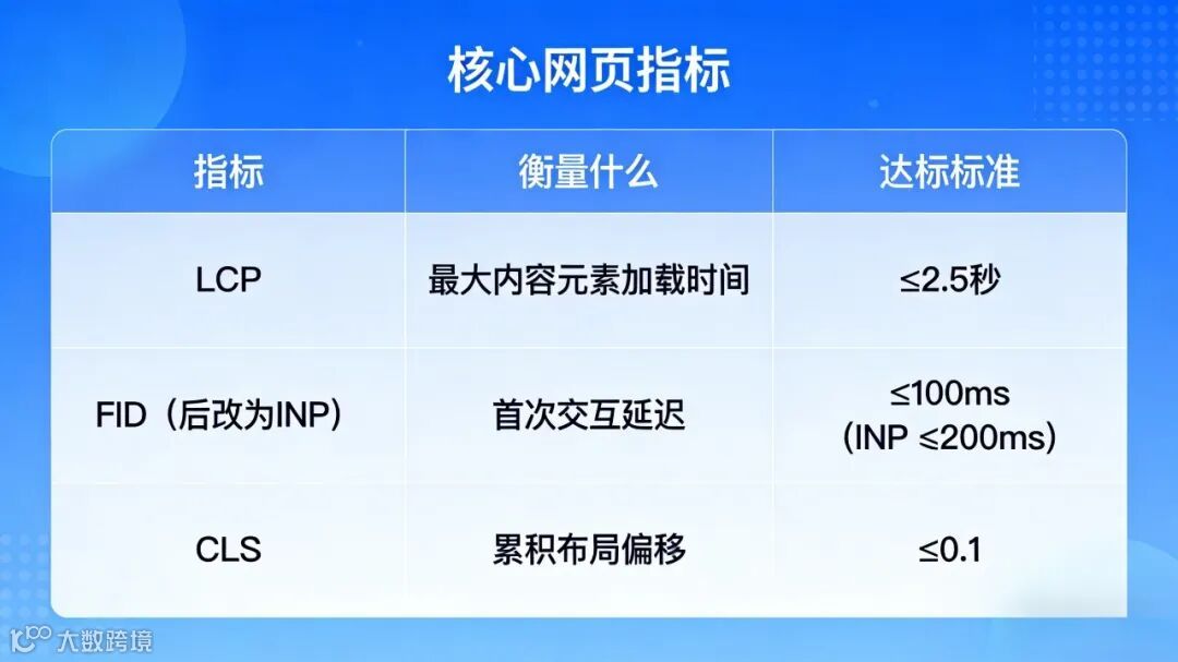 4. 优化技术指标:重点提升INP(与下一次绘制的交互)等核心网页指标,确保用户流畅体验。