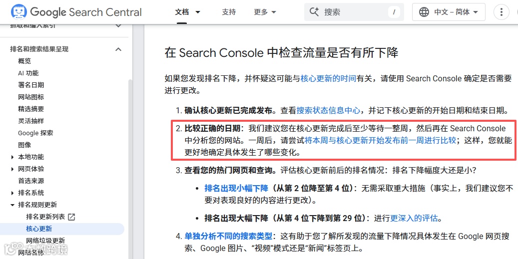 1. 冷静观察两周:核心更新完全生效需约两周,待谷歌标记"更新完成"后再通过Search Console系统分析。