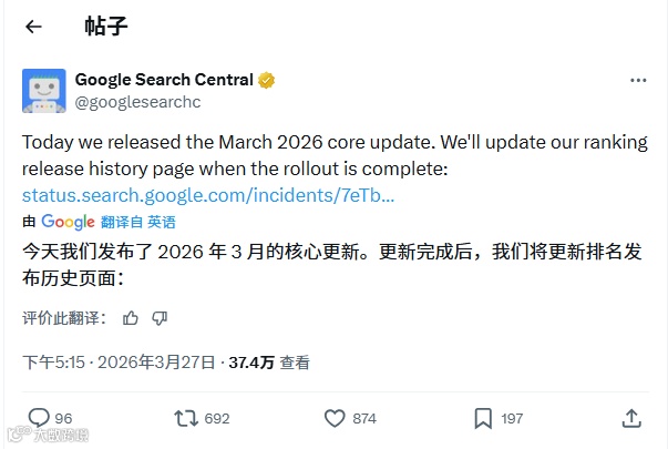 2026年3月27日下午5点,谷歌正式发布2026年3月核心算法更新(March 2026 Core Update)。作为本年度搜索领域的首场重大调整,该更新紧随3月24日完成的垃圾内容更新发布,导致部分外贸B2B企业独立站排名出现剧烈波动。
