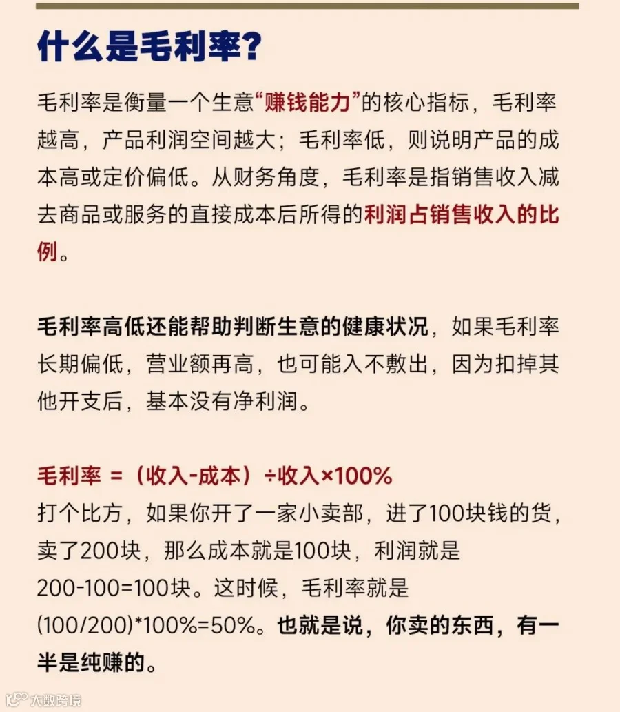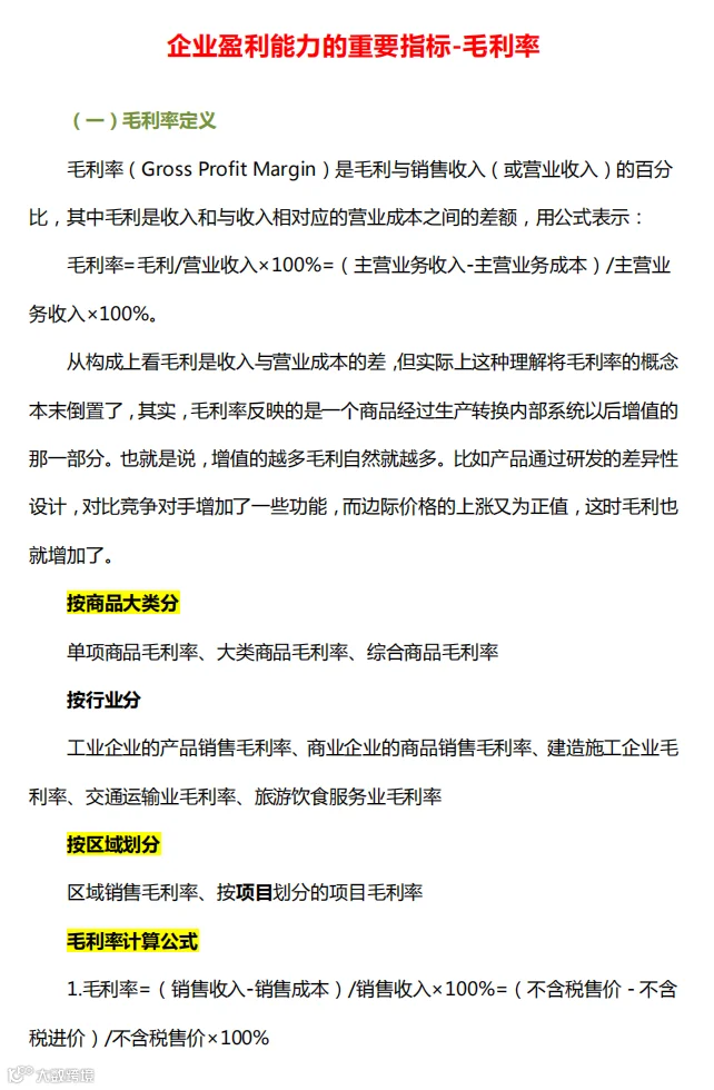 在财务分析中,毛利率和净利率是衡量企业盈利能力的核心指标。其中,毛利率反映企业产品或服务的直接盈利能力,是扣除销售成本后剩余收入占销售收入的比例,计算公式为:(营业收入-营业成本)÷ 营业收入 × 100%。该指标越高,说明企业产品附加值越高,市场竞争力越强。