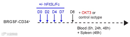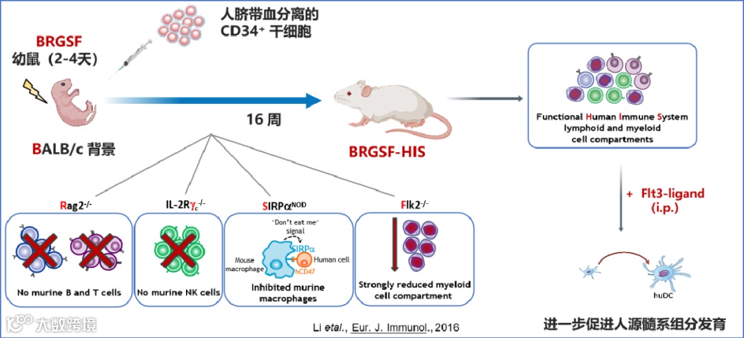 全能人源化HIS(Human Immune System)小鼠模型是在BRGSF上进行构建的。BRGSF是一种高度免疫缺陷小鼠模型,主要特征为缺失成熟的鼠源T、B、NK淋巴细胞,髓系细胞发育严重受阻。将人脐带血分离的CD34+造血干细胞(HSC)移植至BRGSF小鼠体内,再经hFlt3L刺激,这些HSC可分化发育为人源淋巴系和髓系细胞,以这种方式构建的免疫系统人源化小鼠模型被称为BRGSF-HIS。