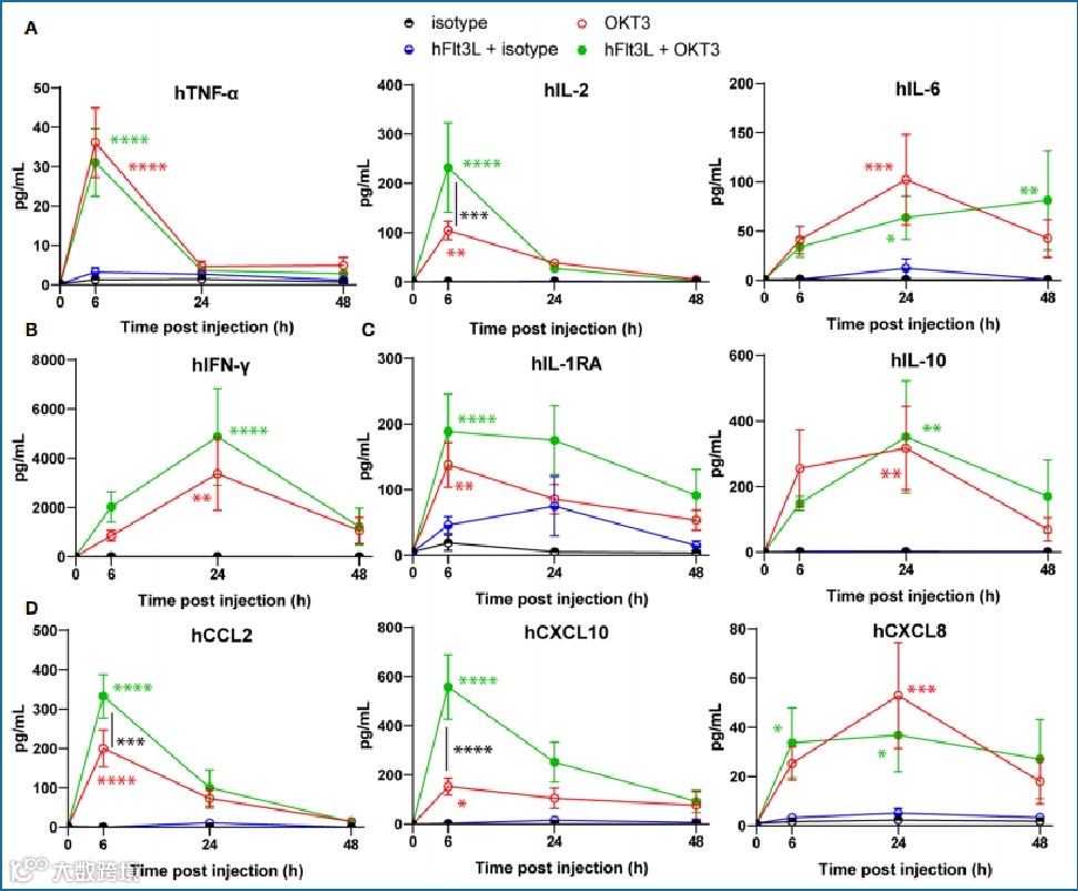 在另一项实验研究中,通过OKT3对genO-BRGSF-HIS (+Flt3L)小鼠进行诱导刺激,在之后的6h,24h,48h进行各细胞因子分泌量检测。