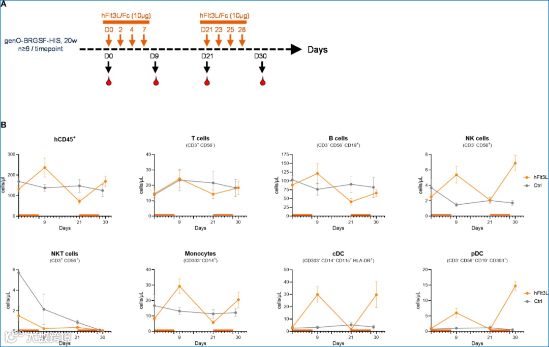 hFlt3L注射后的第2天,单核细胞、cDC和pDC数量增加,随后逐渐恢复至基线水平。进一步测试明确hFlt3L的第二轮处理同样可诱导多种髓系细胞数量的增加,cDC和pDC的数量分别增加了19倍和21倍。此外,genO-BRGSF-HIS小鼠外周血中可检测到了NK细胞,并在hFlt3L刺激后进一步上升。