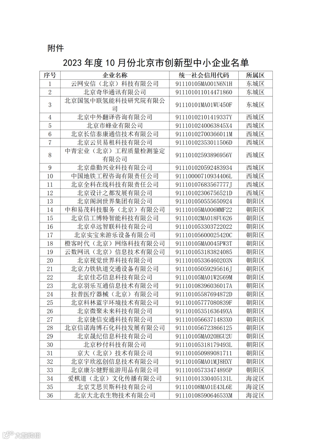 北京市经济和信息化局关于对2023年度10月份北京市创新型中小企业名单进行公告的通知