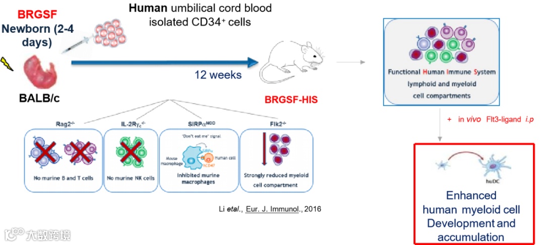 由人 CD34+ 造血干细胞 (HSC) 移植重建得到的 BRGSF-HIS 小鼠具有所有主要的人造血干细胞分化亚群:人源淋巴系细胞 (T、B、NK细胞),以及人源髓系细胞组分 (传统的树突状细胞 (cDCs)、浆细胞样树突状细胞 (pDCs)和单核/巨噬细胞等)。BRGSF-HIS (+Flt3L) 小鼠具有相对健全的人源免疫系统,其应用场景十分广泛,如肿瘤免疫治疗效果评估,疫苗研究,自免及感染性疾病研究,安全性评估等。