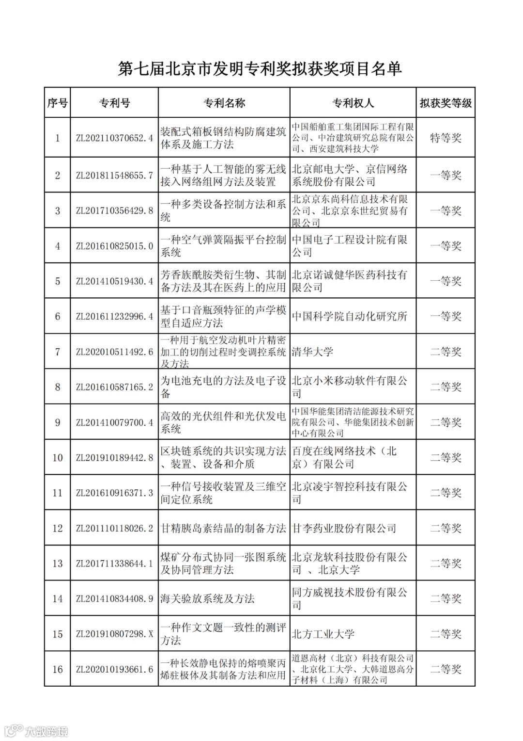 关于第七届北京市发明专利奖评审结果公示的通知