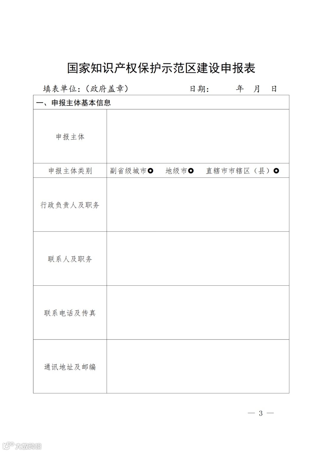 (一)地方申报。首次申报示范区建设的城市(地区)需填写示范区建设申报表(附件1),制定本地区建设方案(参考提纲见附件2),提供说明本地区工作基础的证明材料。经所属省(自治区、直辖市)人民政府审核同意后,由所在省级知识产权管理部门汇总后统一向国家知识产权局提出申报。