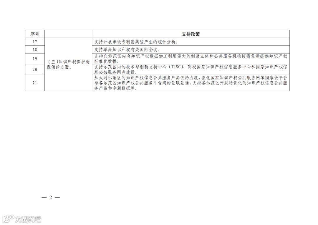 为进一步加强对示范区建设的指导和支持,现发布第二批示范区建设支持政策清单(附件4),继续从知识产权保护体系完善、人才队伍建设、资源保障等方面予以优先支持,在知识产权保护创新性工作中予以优先考虑。