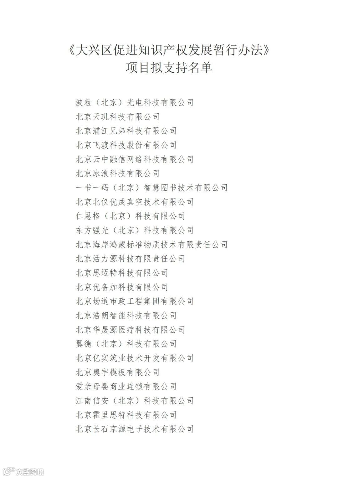 关于《大兴区促进知识产权发展暂行办法》项目拟支持名单的公示
