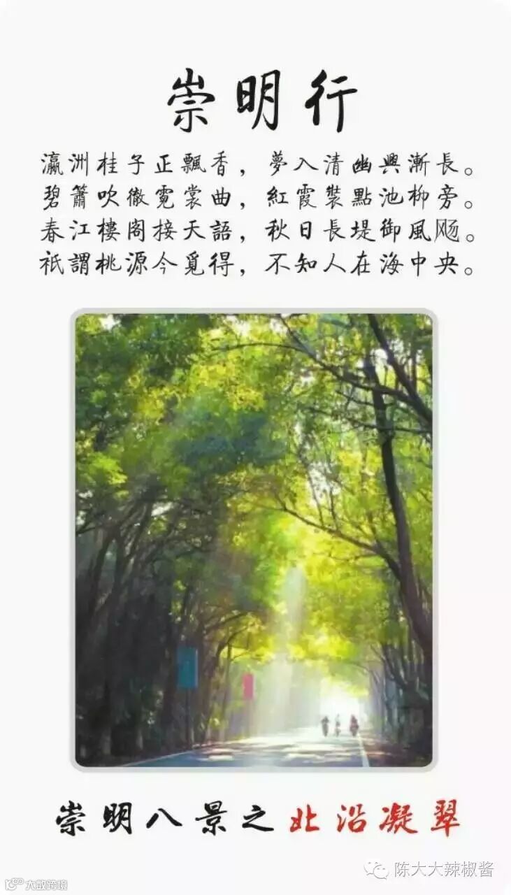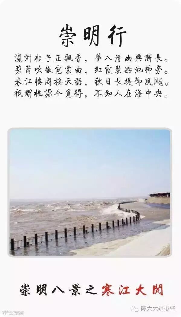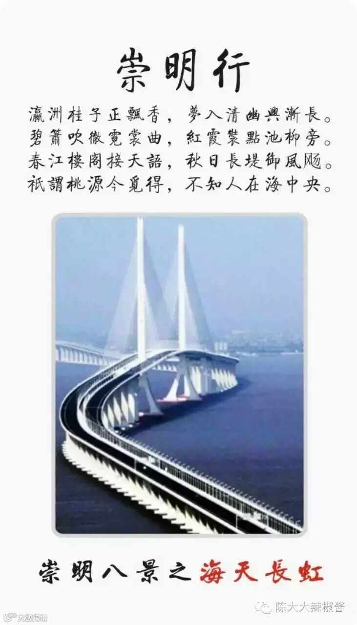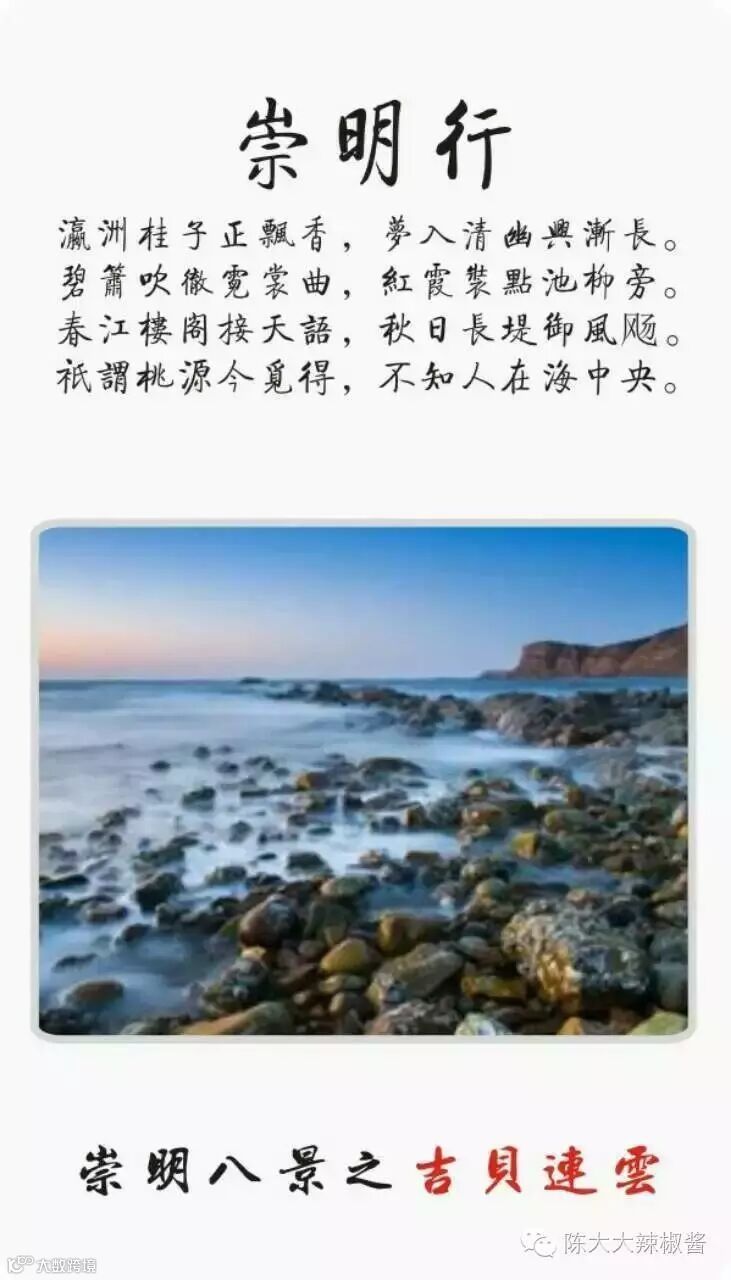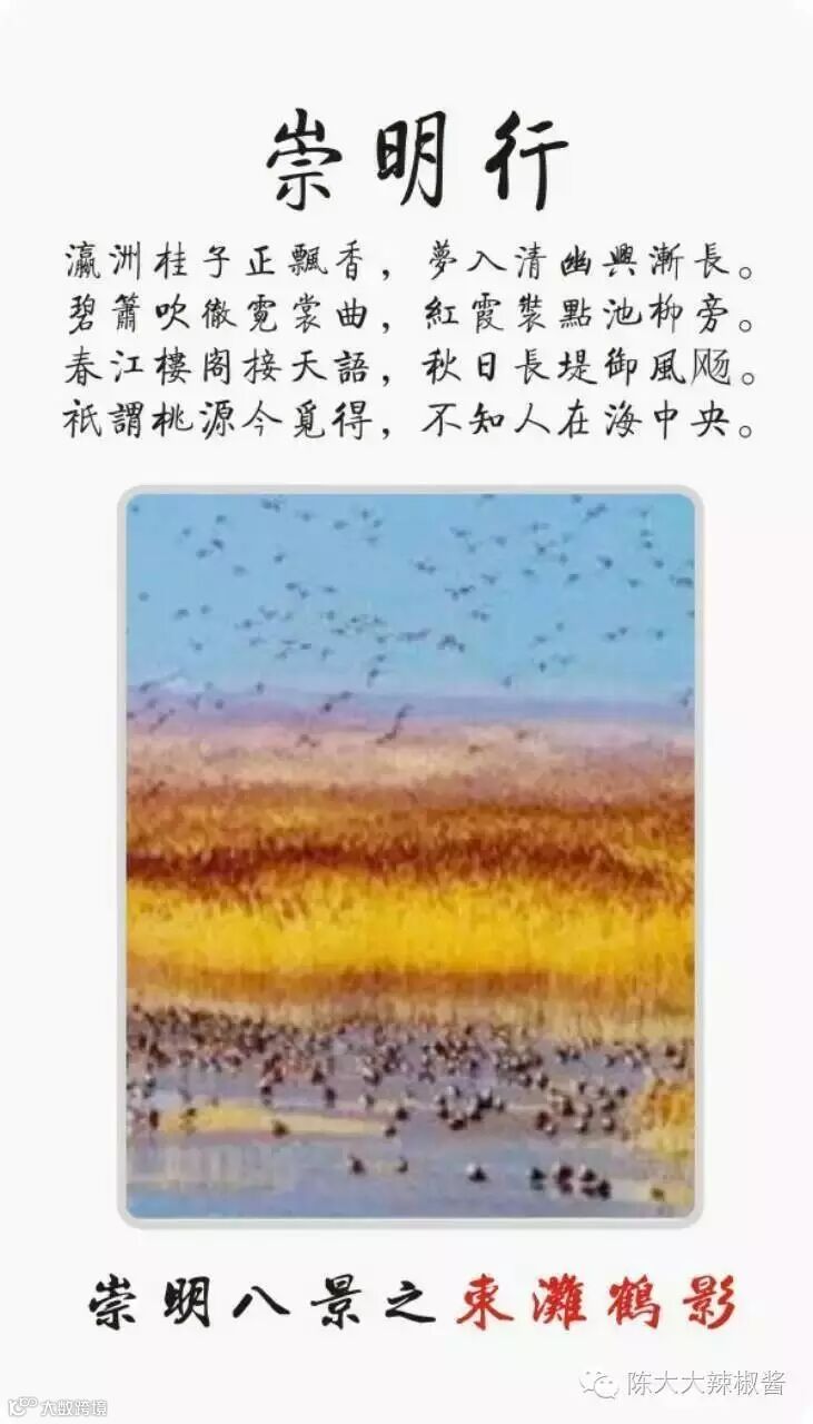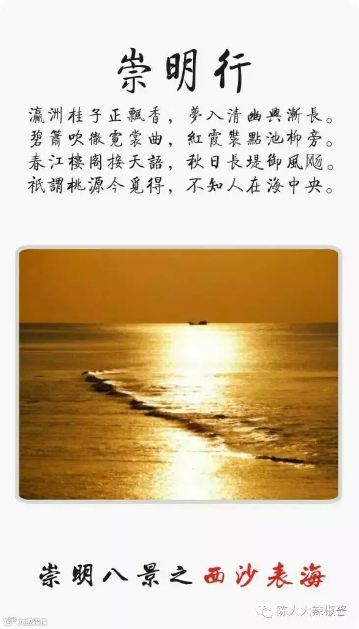 崇明“瀛洲八景”:东滩芦荡、西沙夕照、海天长虹、镜影长兴、横沙日出、长堤读潮、北沿凝翠、森林绿梦: