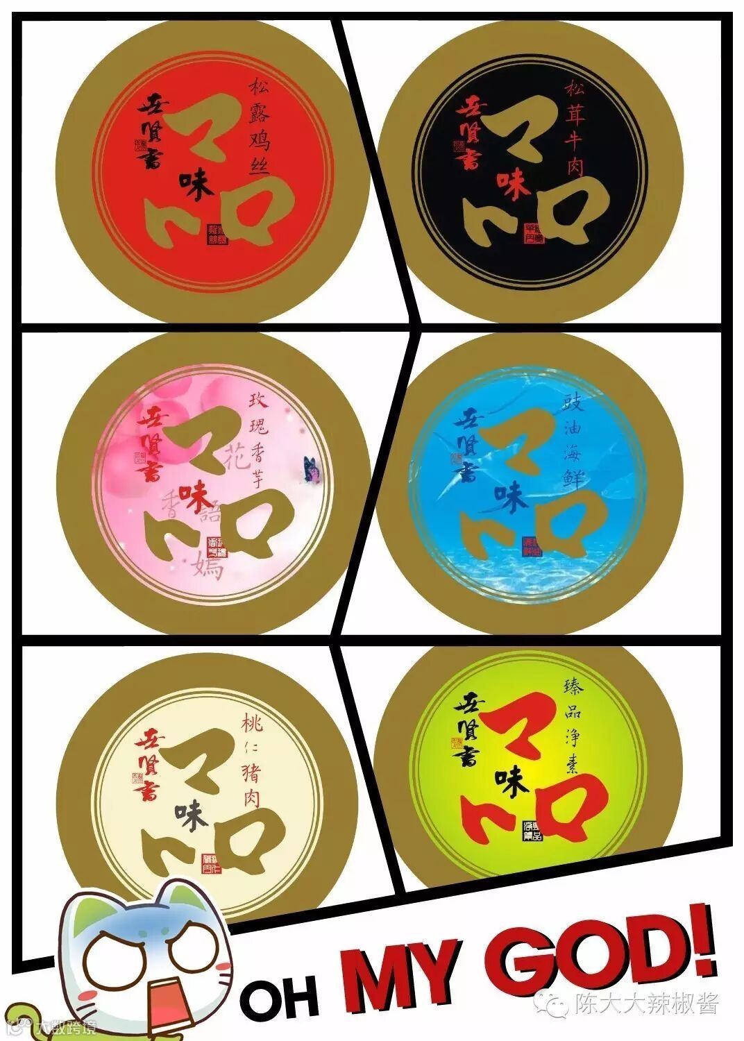 陈大大油辣子六种口味:松茸牛肉、松露鸡丝、桃仁猪肉、豉油海鲜、玫瑰香芋、臻品净素,更香更辣更好吃!