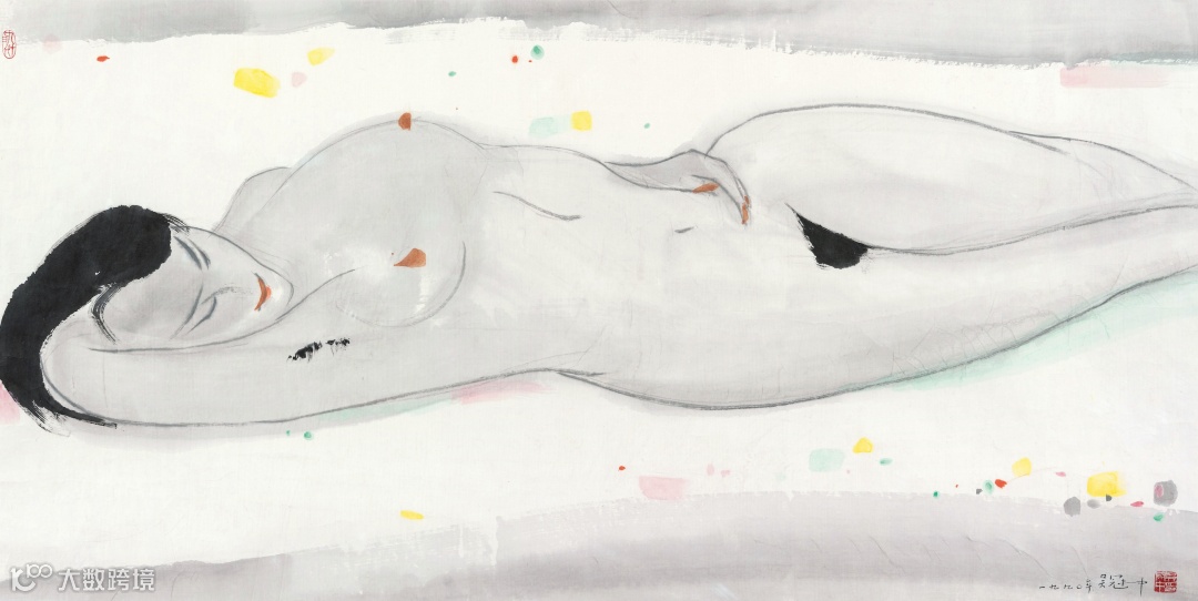此次拍卖最受瞩目的是一幅来自艺术家吴冠中的水墨画。这位20世纪中国乃至国际艺术界最受瞩目的大师代表了国画形式抽象美感的巅峰。《卧》是他晚年艺术风格成熟之作,用彩墨勾勒出江南女子朴素而又意味深长的美。相较于其70年代深入刻画细节的油画,此作具有简洁概括的写意倾向,流畅线条下描绘出女体的妩媚曼妙,浸润着一种抑扬顿挫的节奏韵律,实乃其艺术生涯中的杰作,收藏价值不言自明。